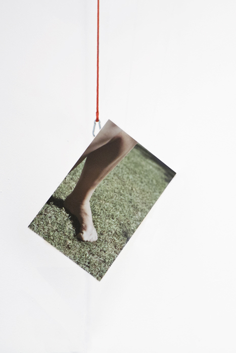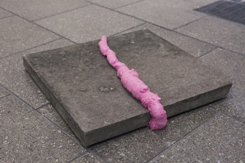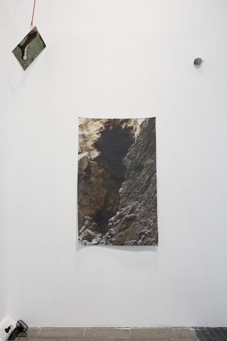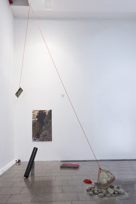 Rubble, aggregate rock, rope with double figure of 8 climber’s knot running to ceiling, belaying mounted giclée print facing East, attached to the wall with a carabiner, photograph printed on cotton calico fabric, activated fan pointed towards the fabric, black painted tube lined with giclée print, two bricks, mirror bouncing light into the tube, cracked concrete paving slab, pink expanding foam.